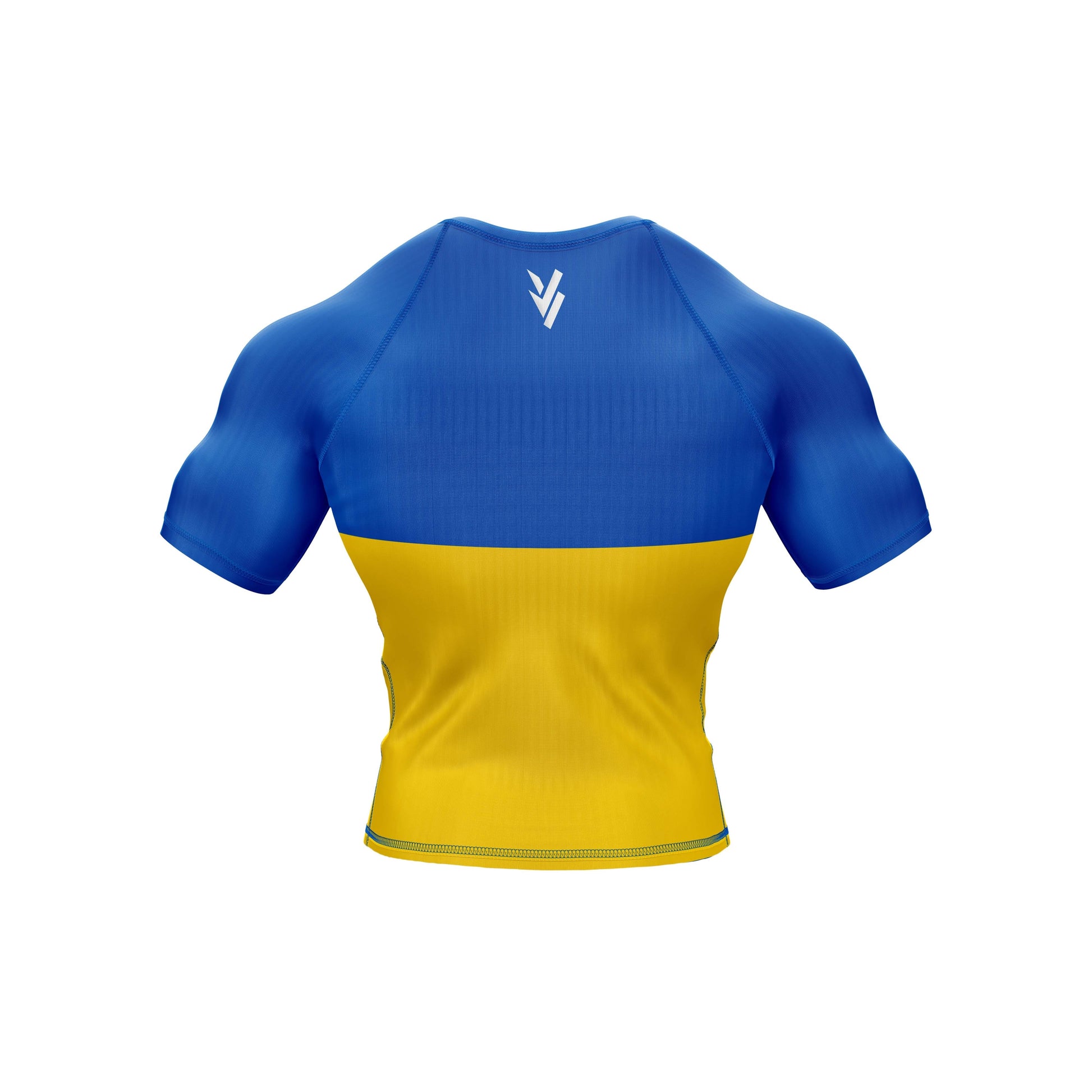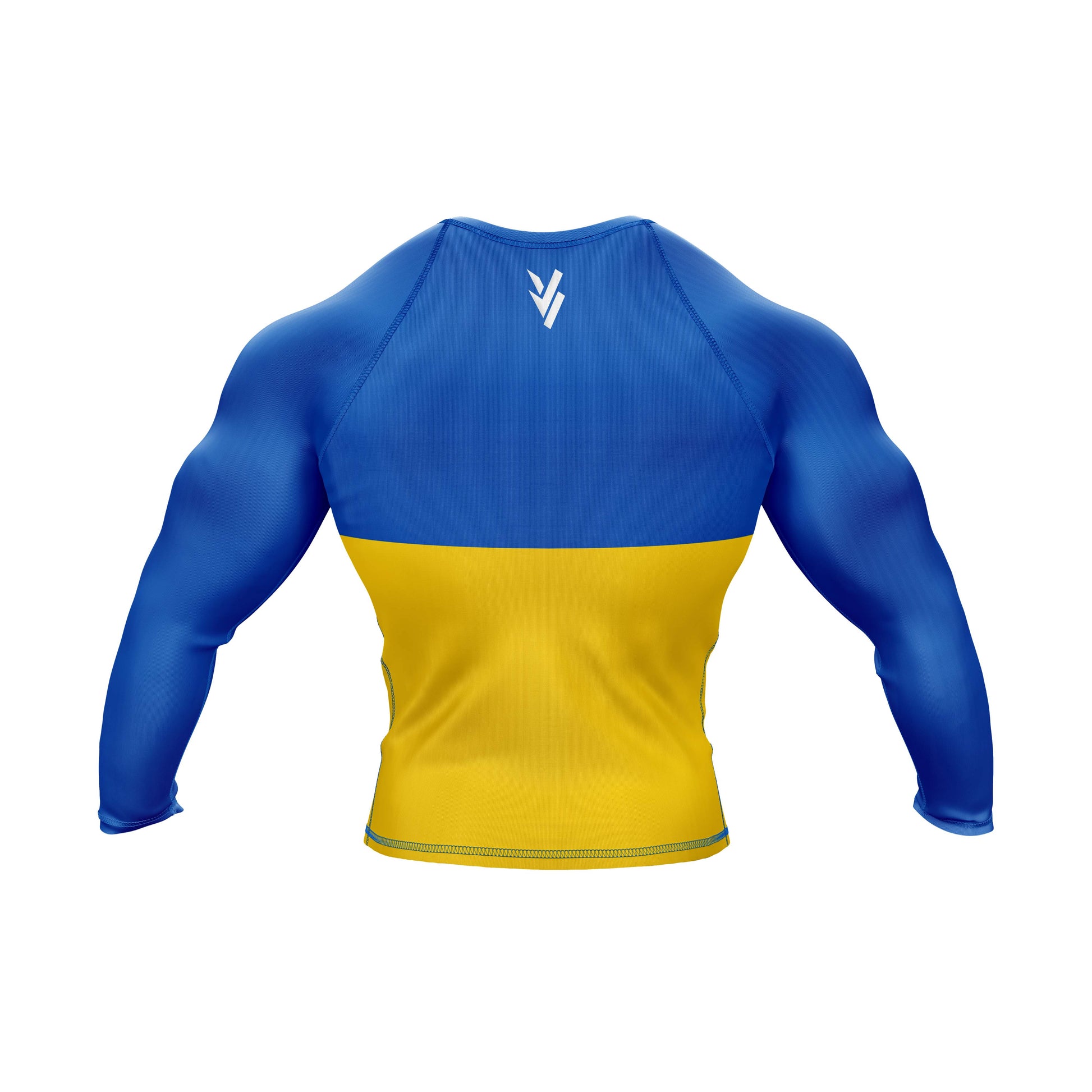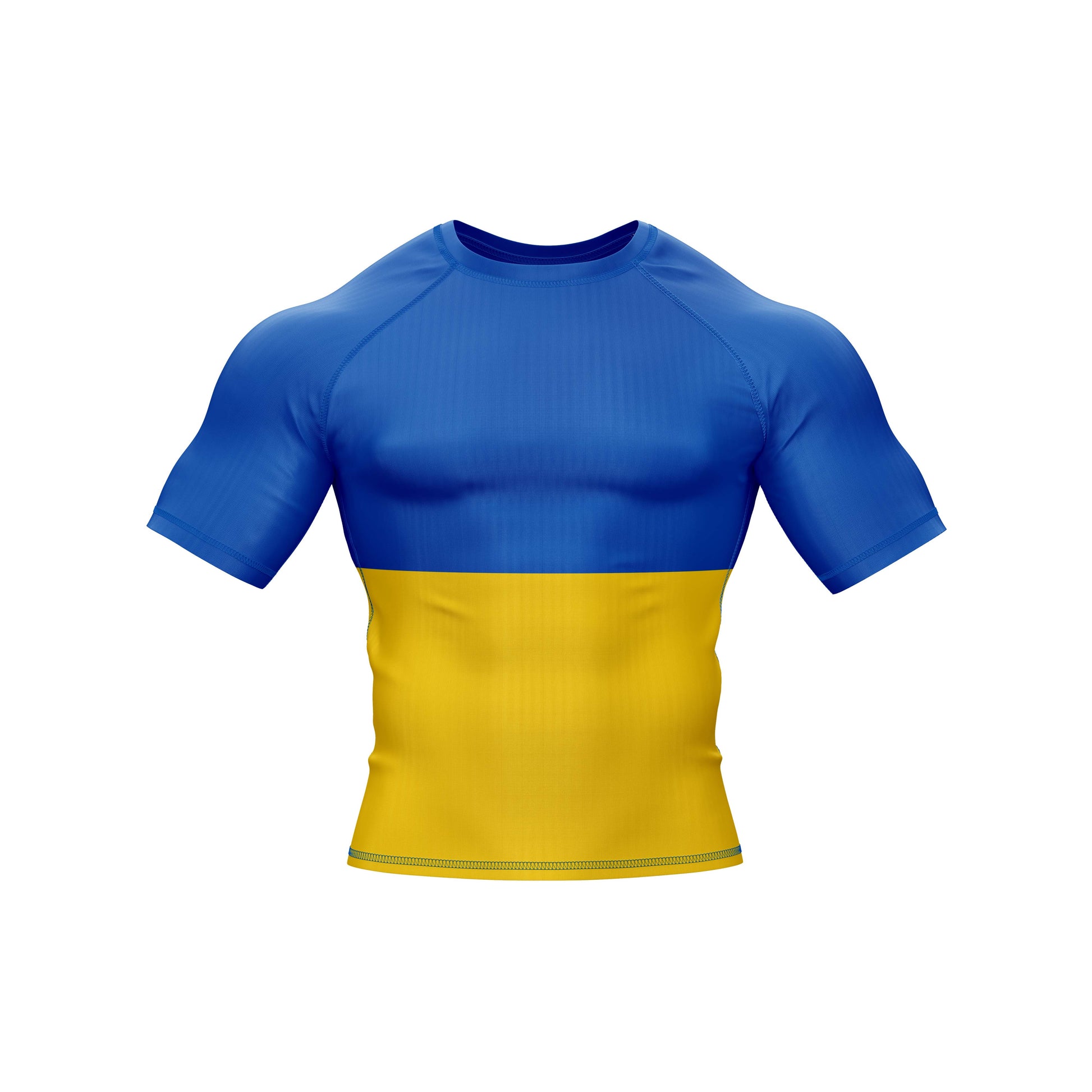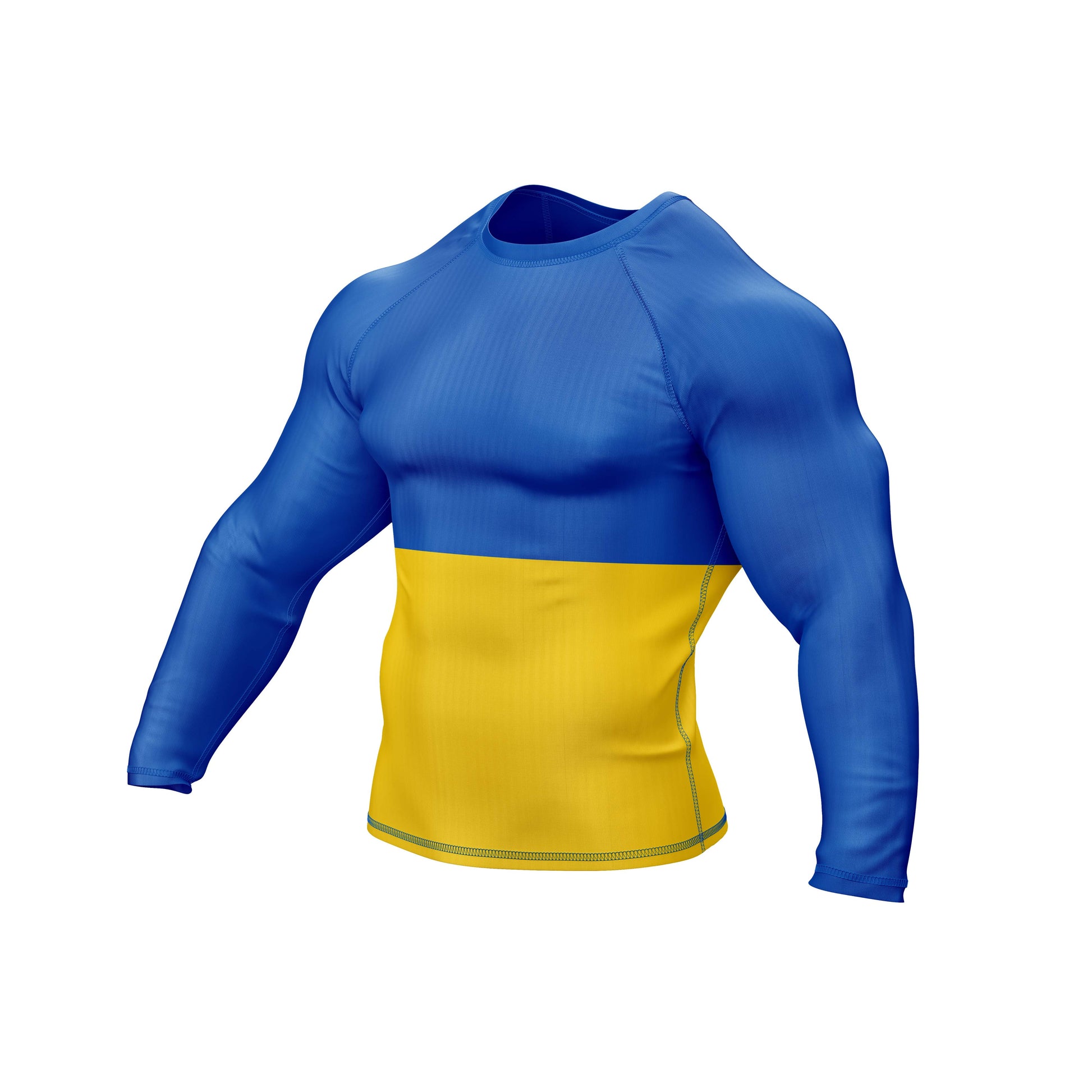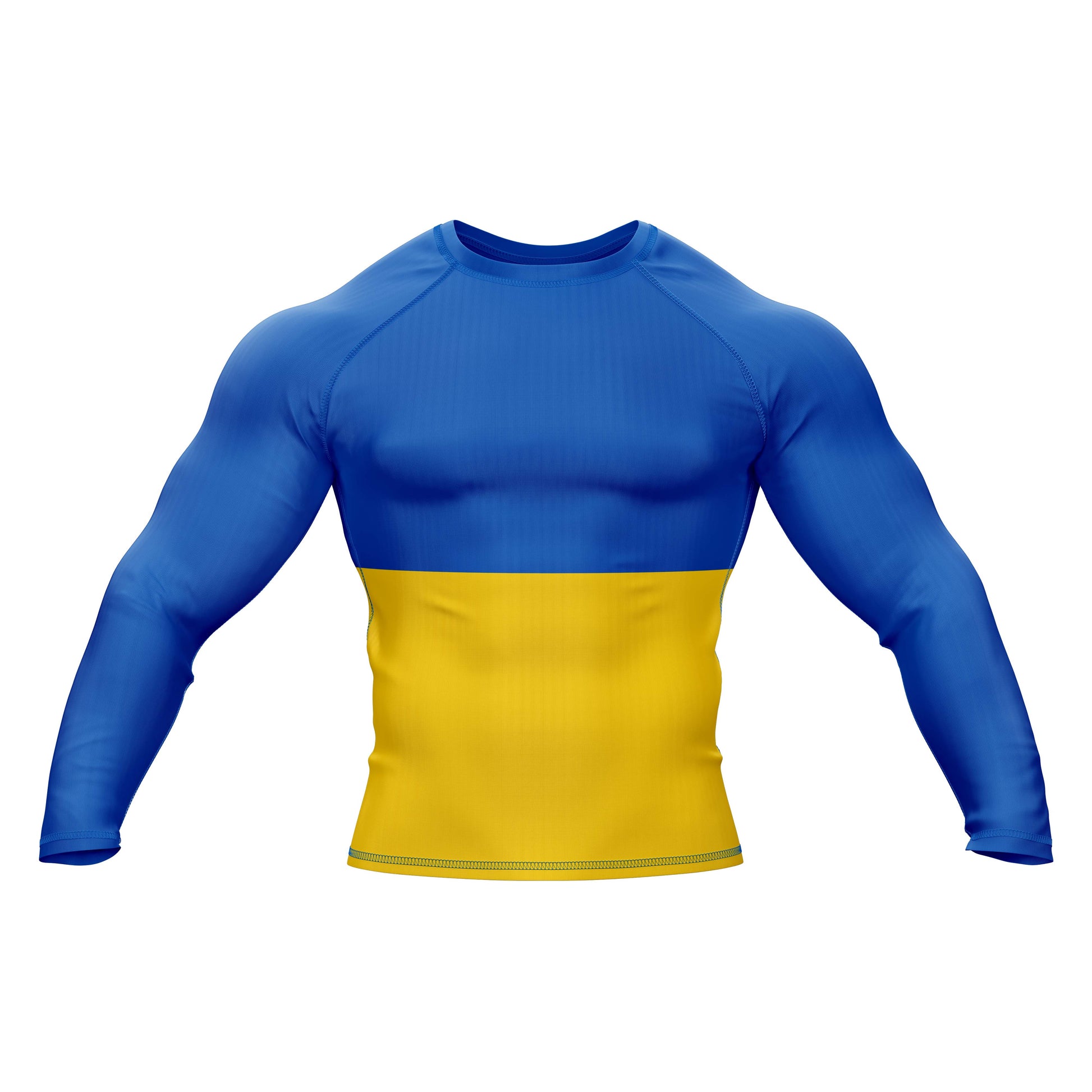 The premium flag sublimation design features long and short sleeves, a round neck, and a color scheme based on the Ukraine flag. You can use it at the gym or in combat. It is made of spandex.