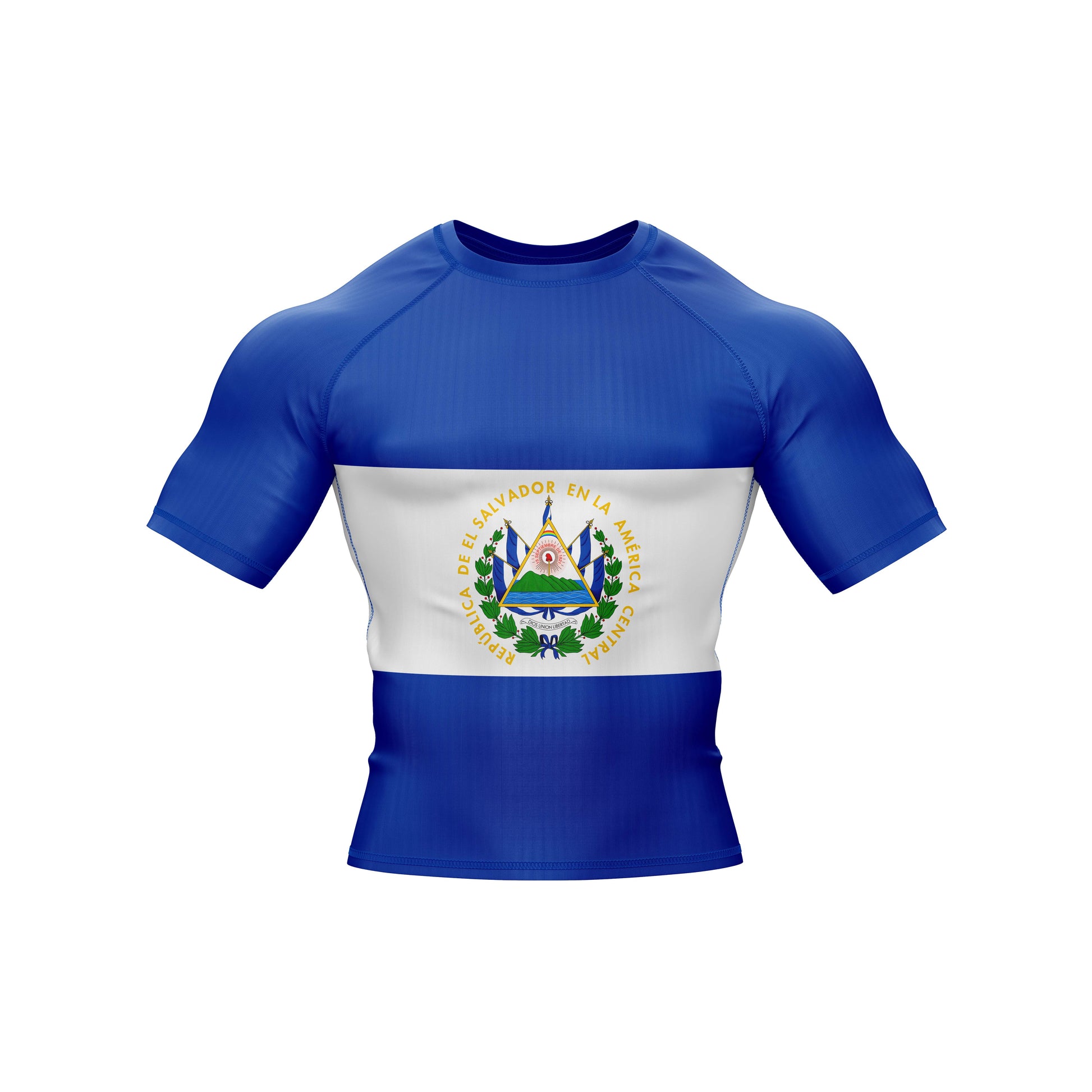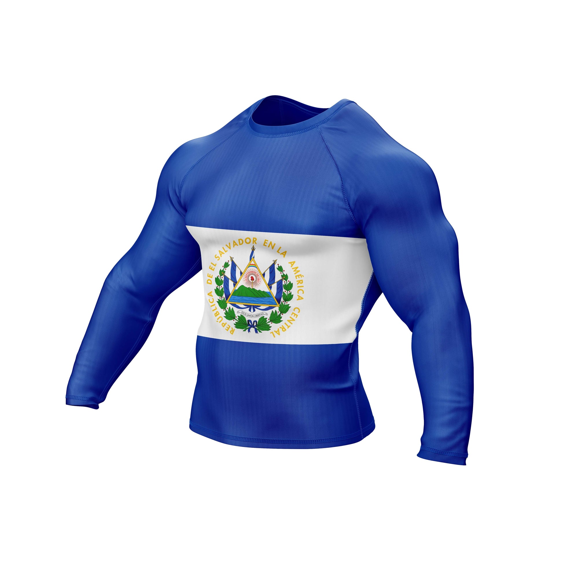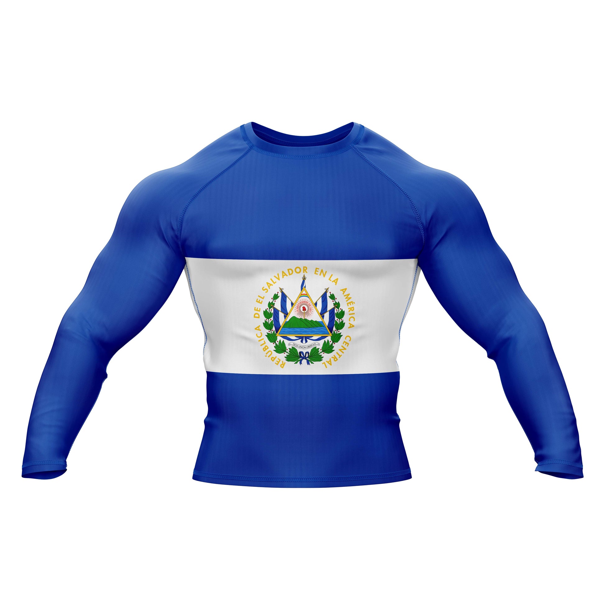 The premium flag sublimation design features long and short sleeves, a round neck, and a color scheme based on the El Salvador flag. You can use it at the gym or in combat. It is made of spandex.