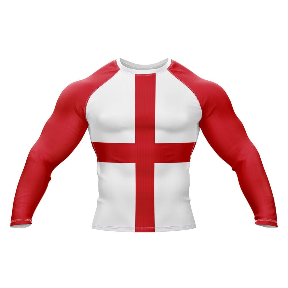 The premium flag sublimation design features long and short sleeves, a round neck, and a color scheme based on the England flag. You can use it at the gym or in combat. It is made of spandex.