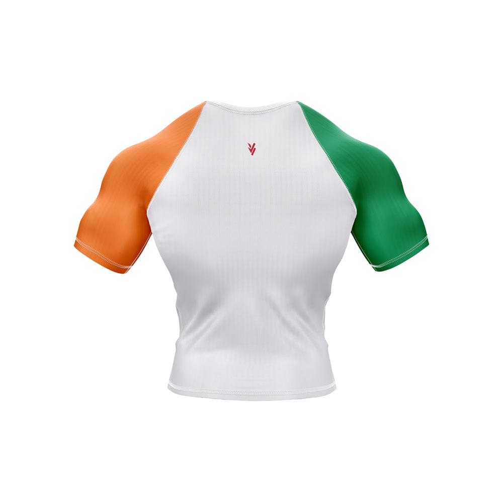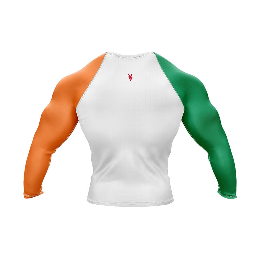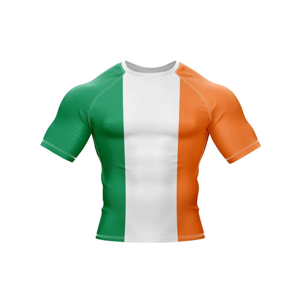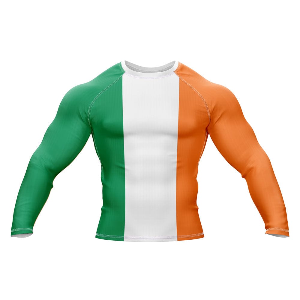 The premium flag sublimation design features long and short sleeves, a round neck, and a color scheme based on the Ireland flag. You can use it at the gym or in combat. It is made of spandex.