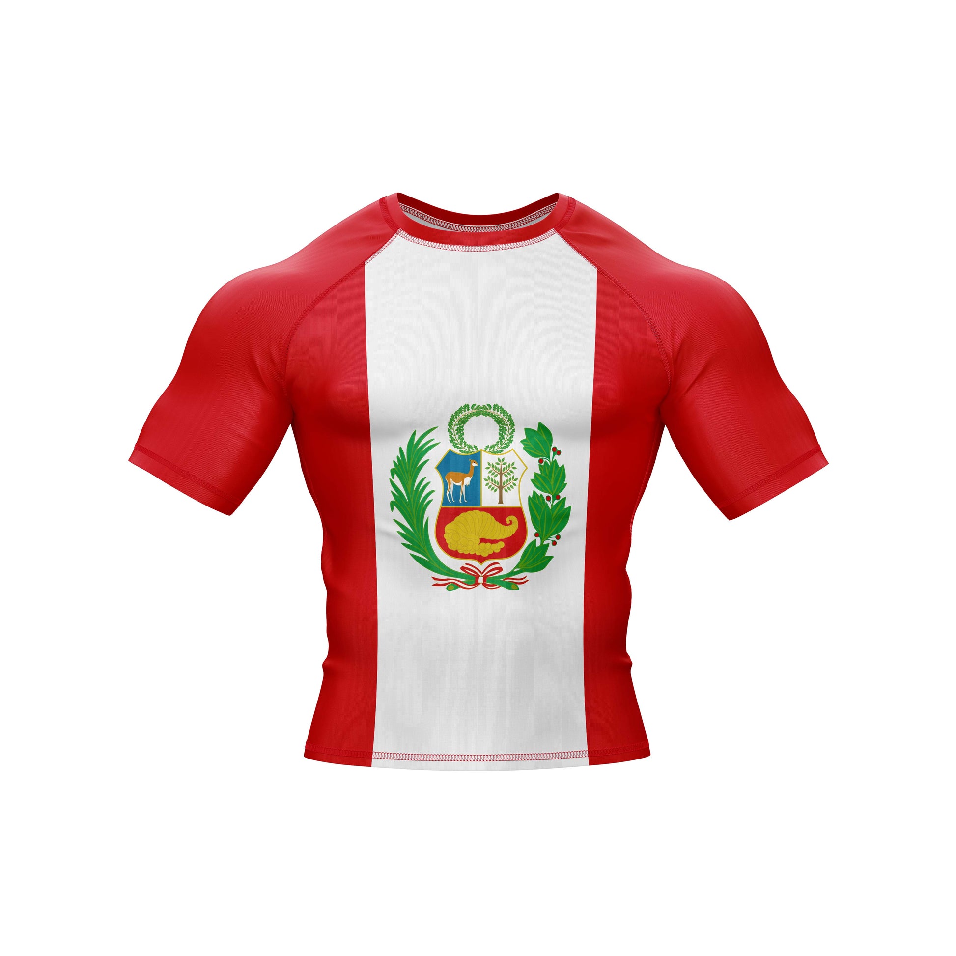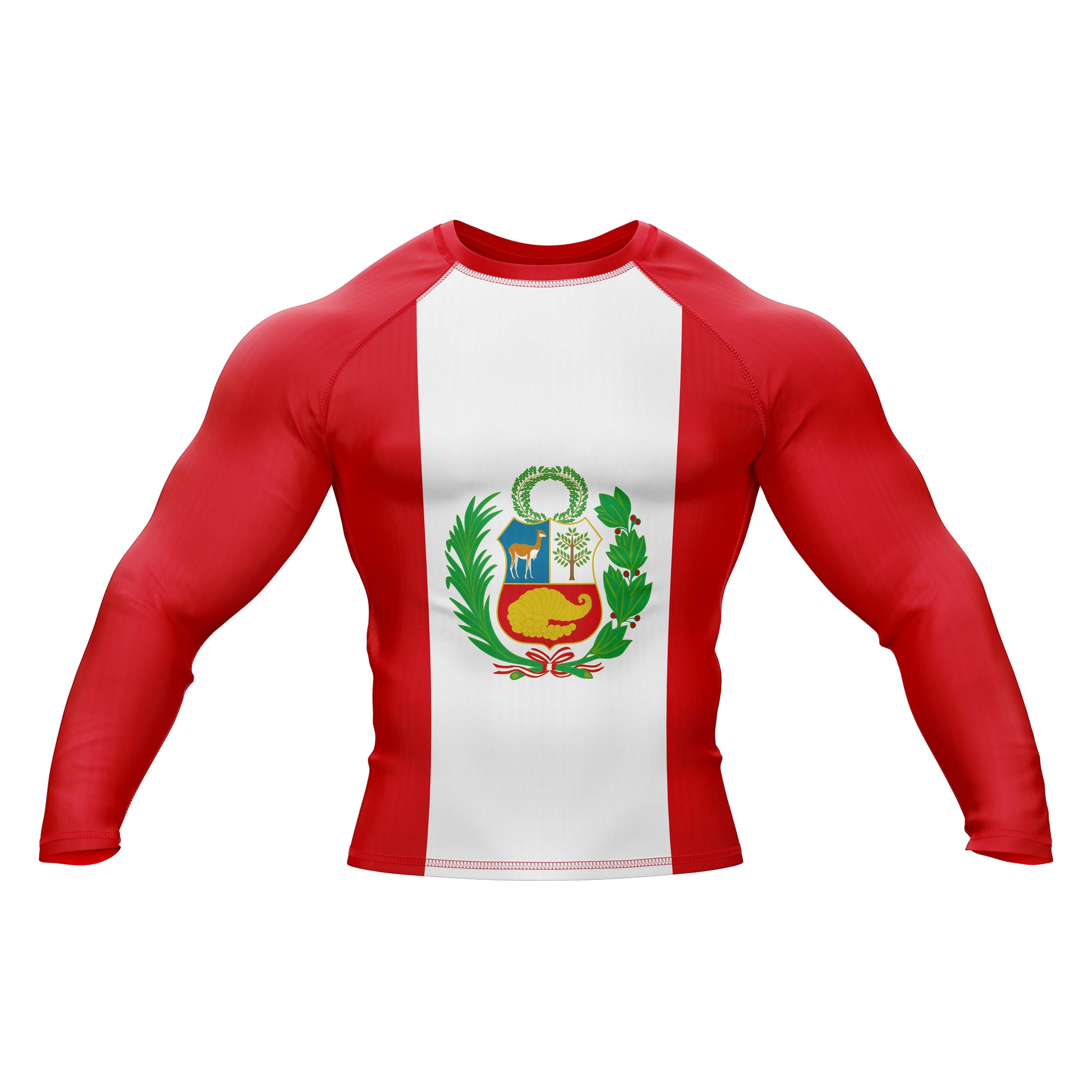 The premium flag sublimation design features long and short sleeves, a round neck, and a color scheme based on the Peru flag. You can use it at the gym or in combat. It is made of spandex.