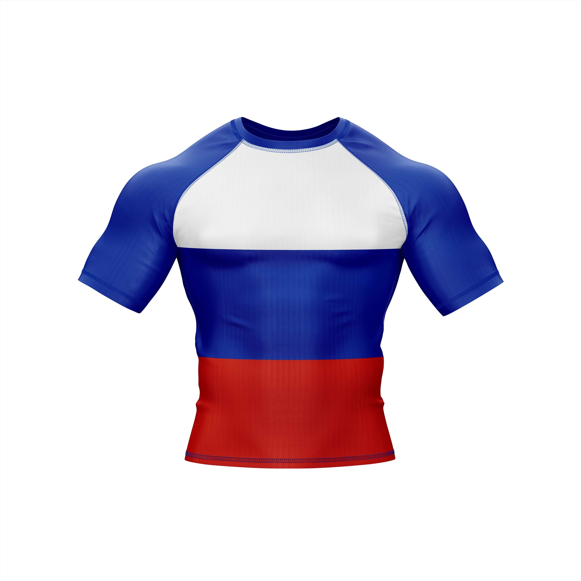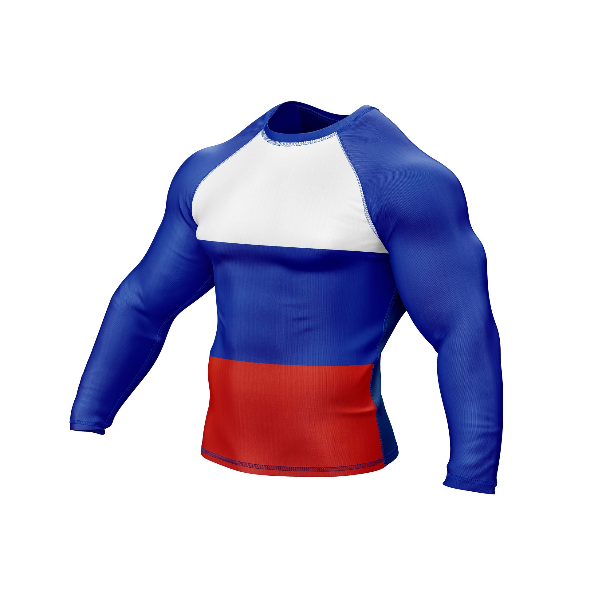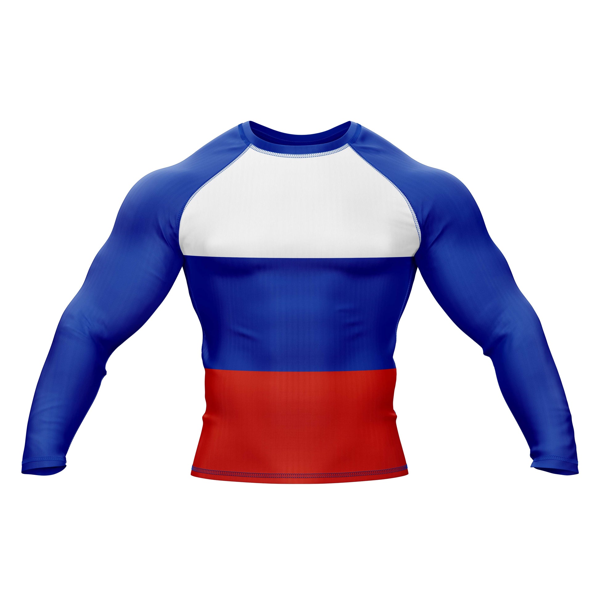 The premium flag sublimation design features long and short sleeves, a round neck, and a color scheme based on the Russian flag. You can use it at the gym or in combat. It is made of spandex.