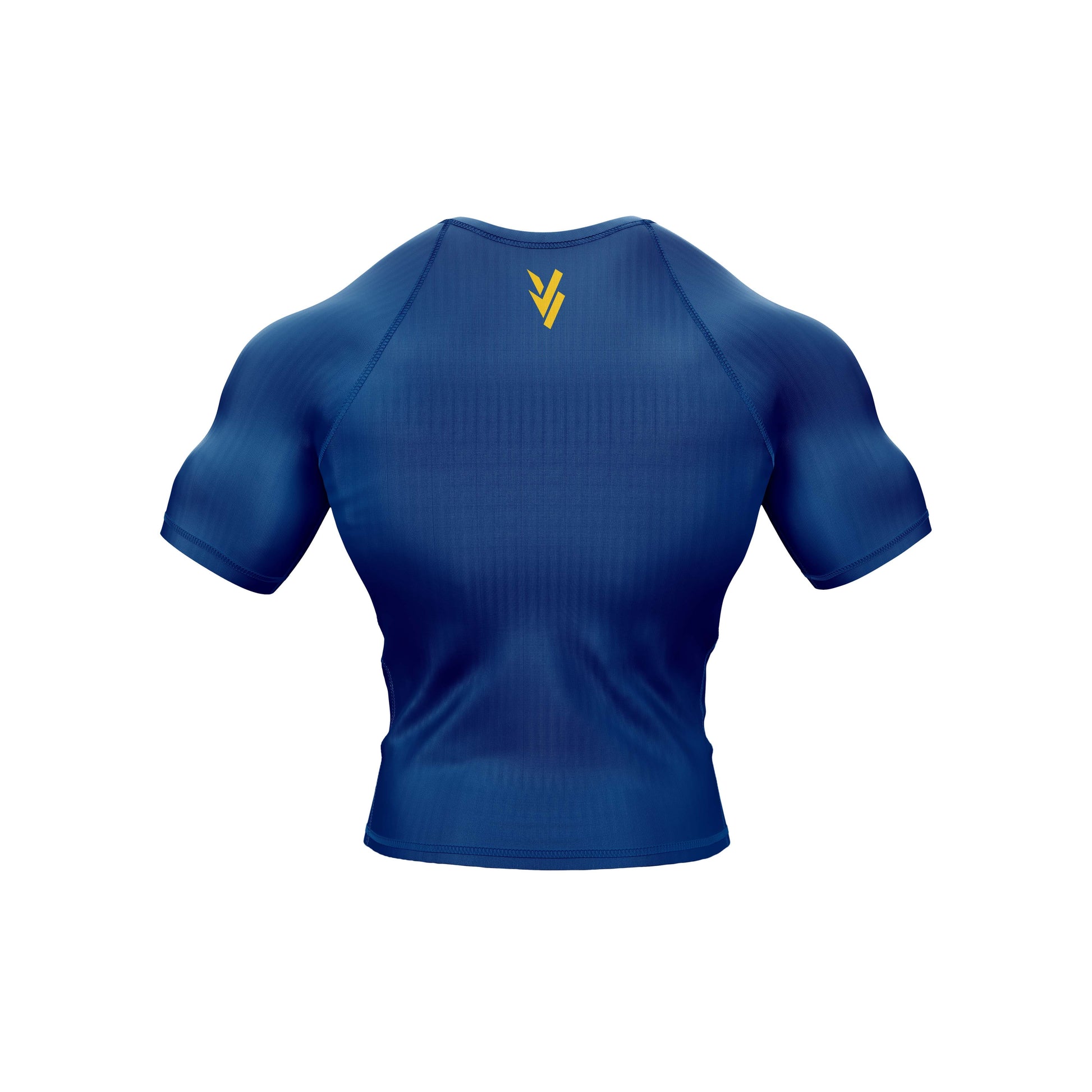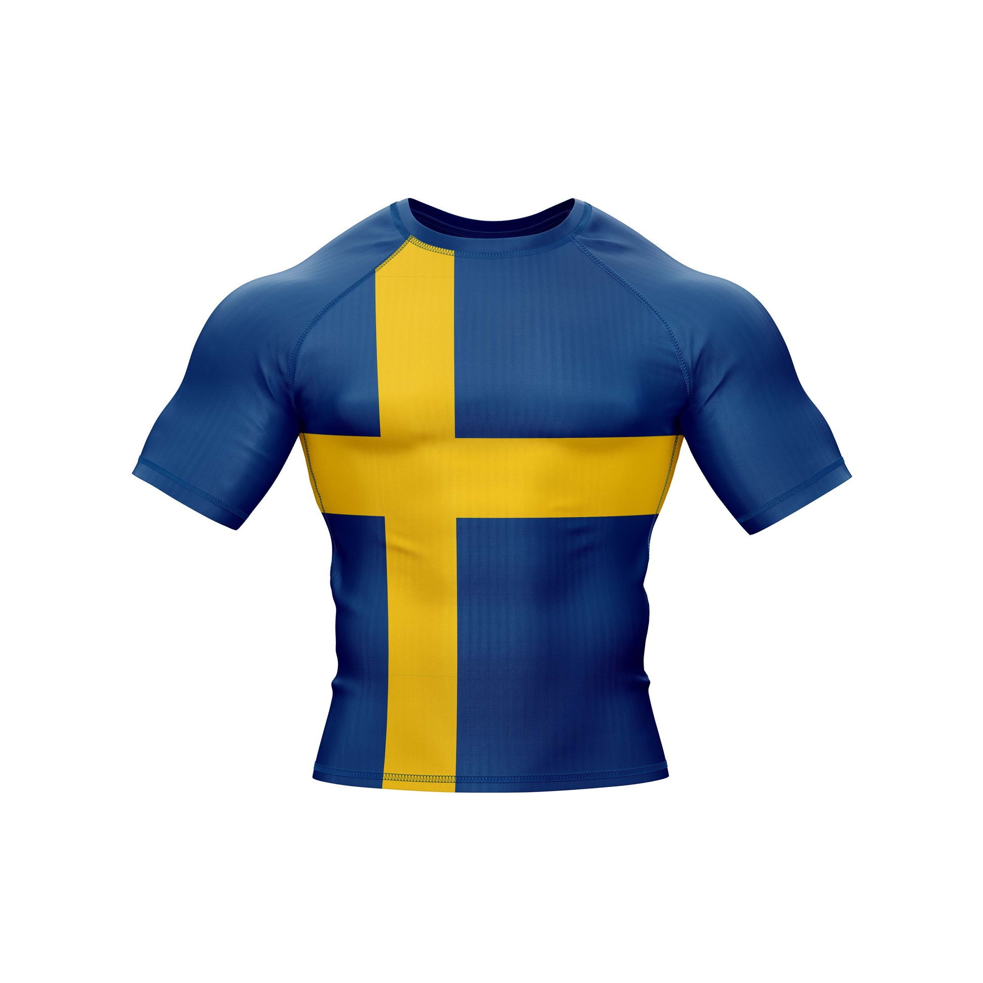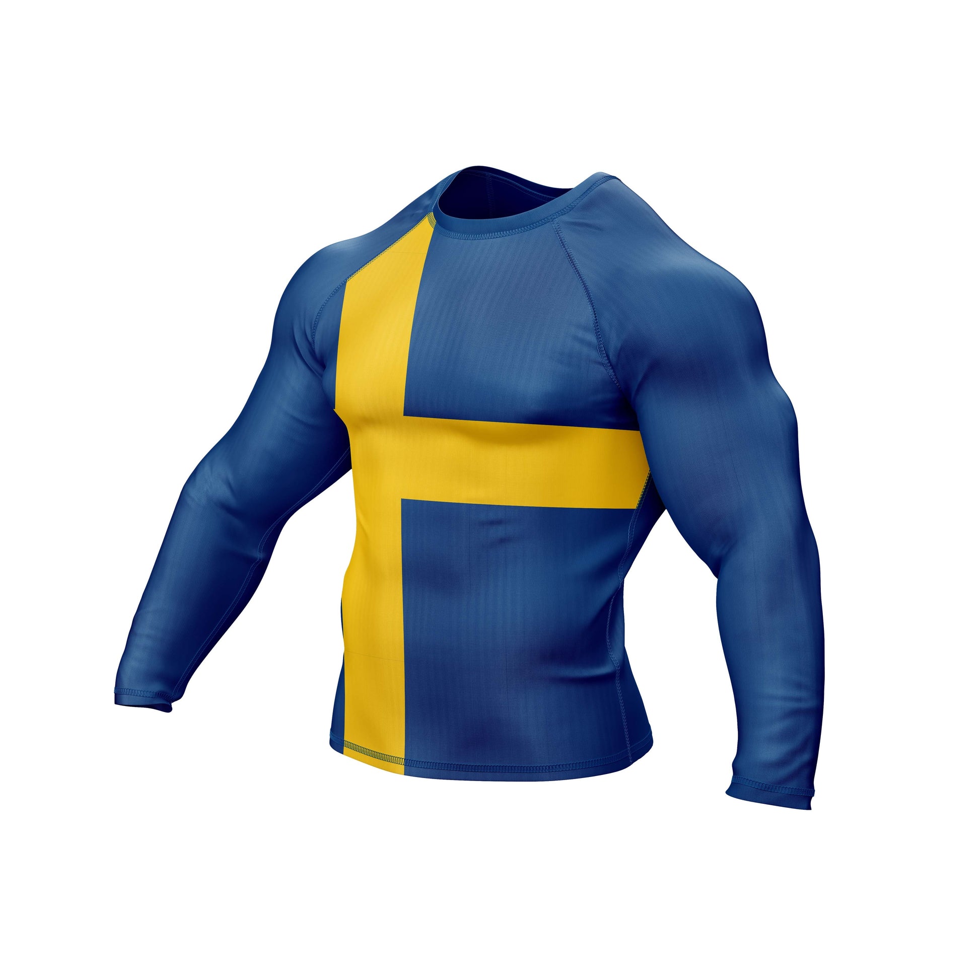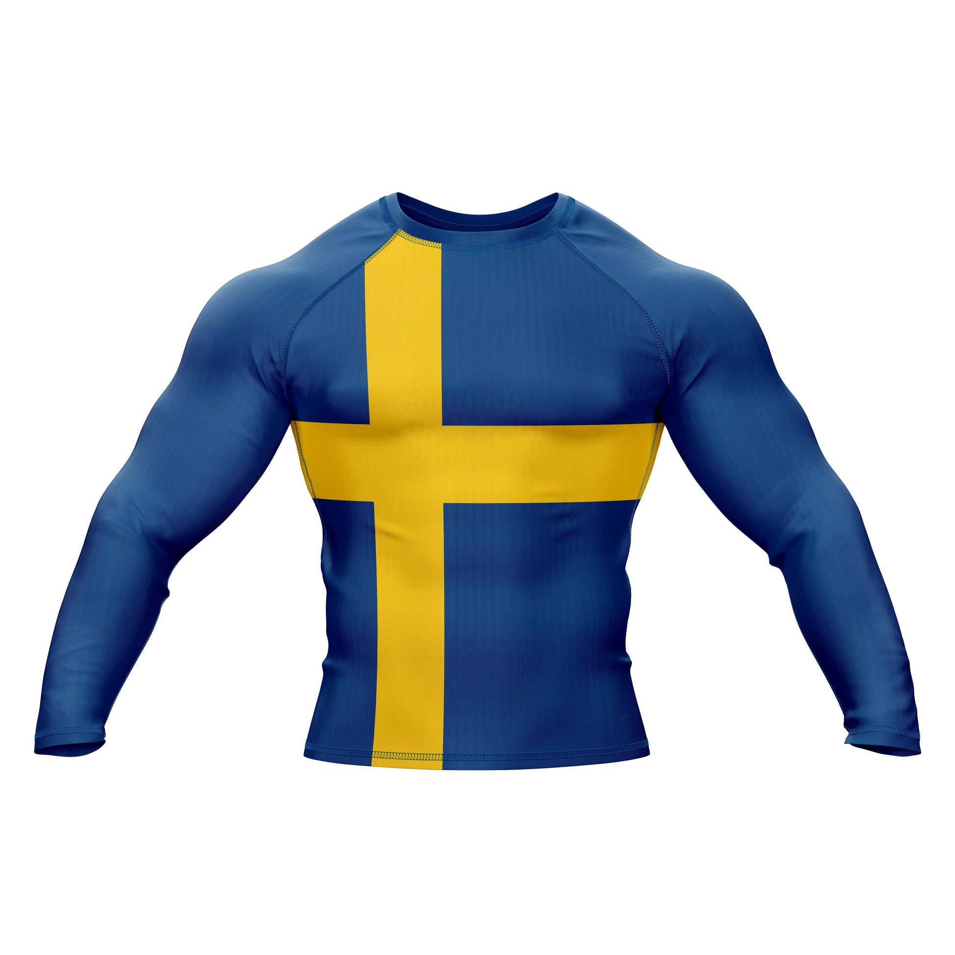 The premium flag sublimation design features long and short sleeves, a round neck, and a color scheme based on the Sweden flag. You can use it at the gym or in combat. It is made of spandex.