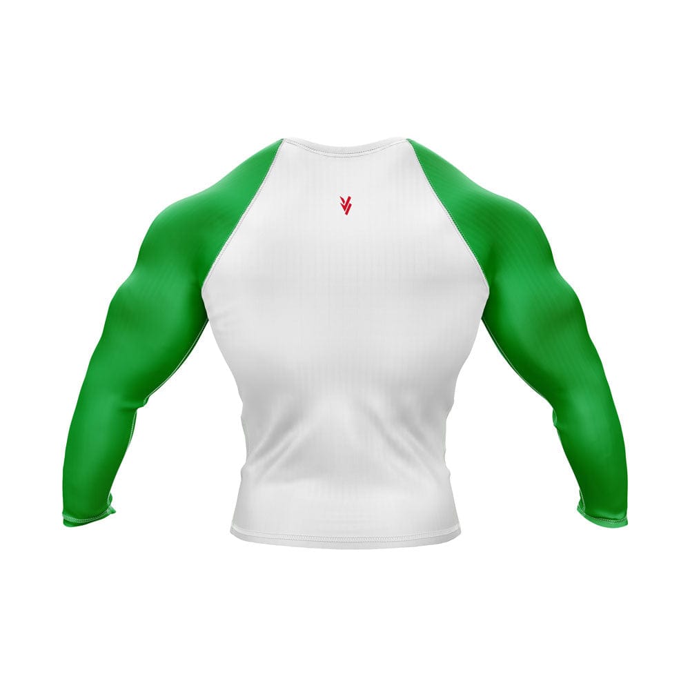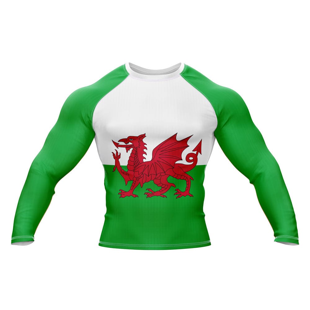 The premium flag sublimation design features long and short sleeves, a round neck, and a color scheme based on the Wales flag. You can use it at the gym or in combat. It is made of spandex.