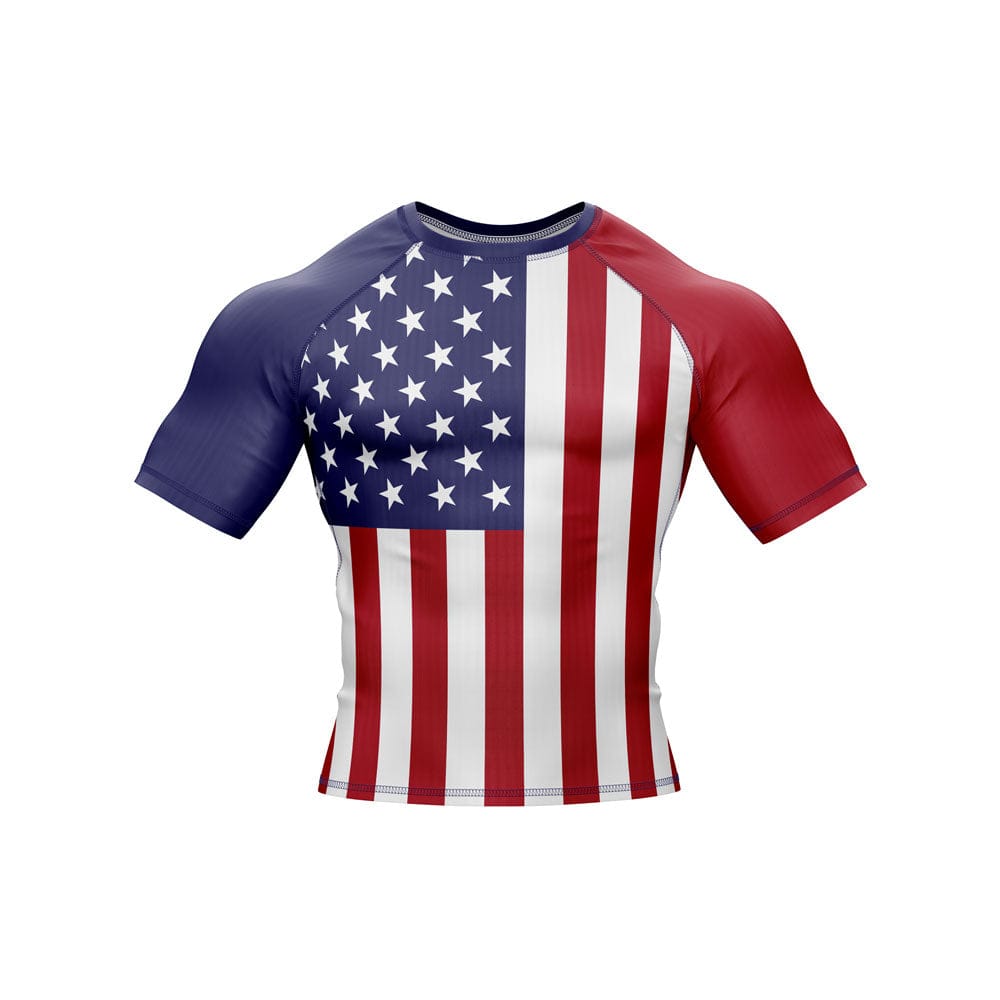 The premium flag sublimation design features long and short sleeves, a round neck, and a color scheme based on the US flag. You can use it at the gym or in combat. It is made of spandex.