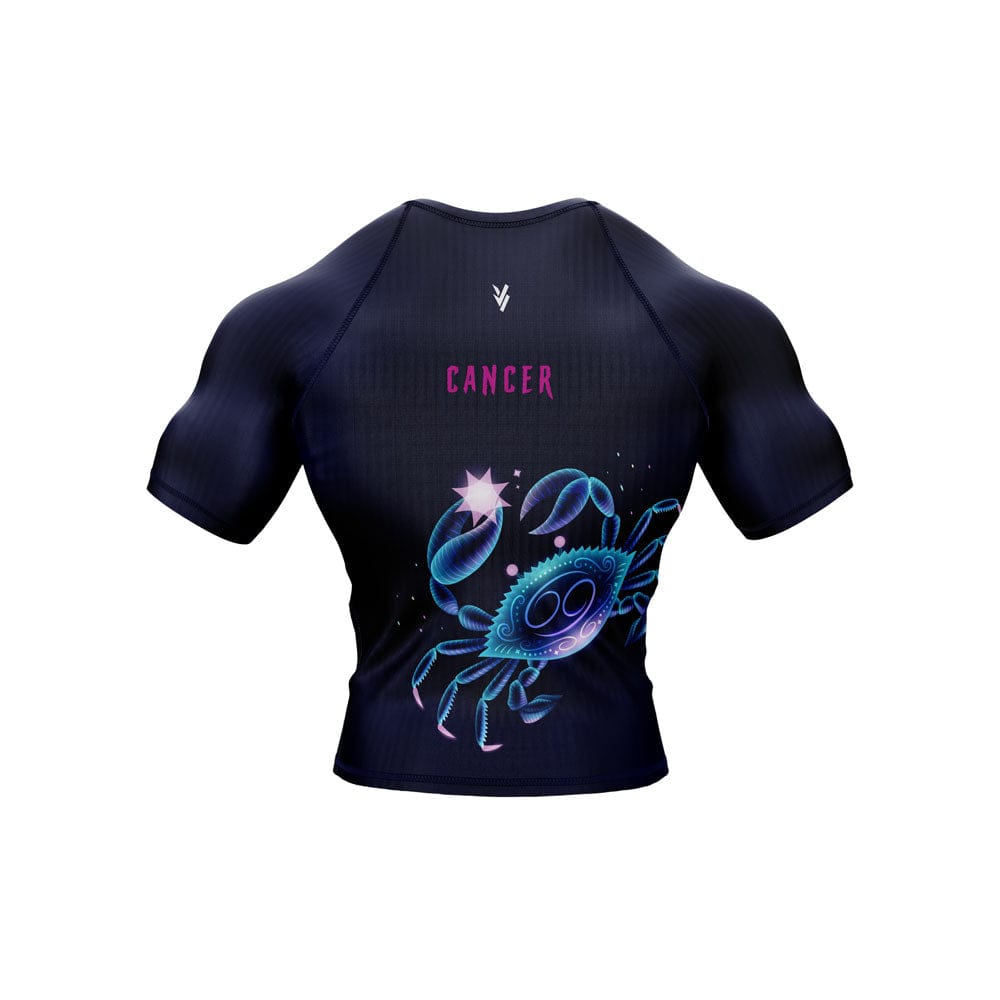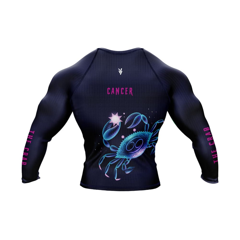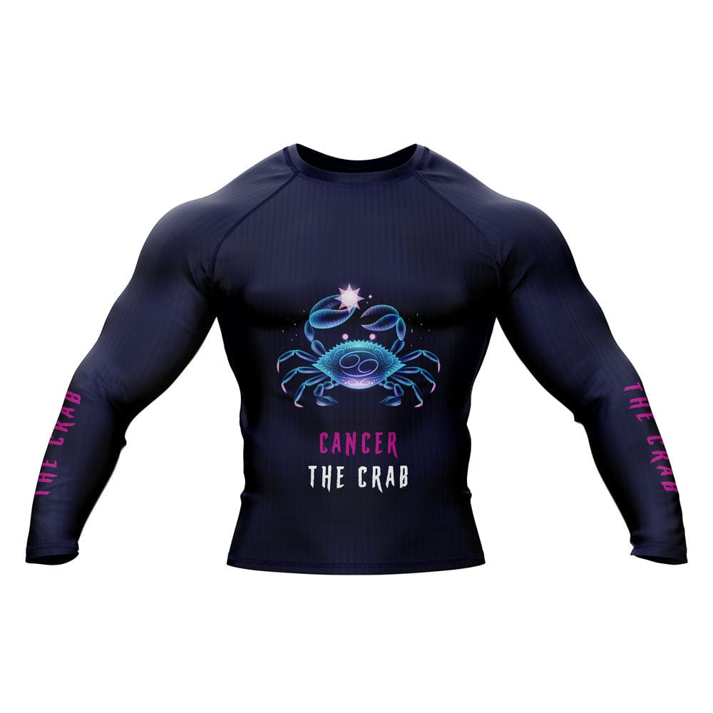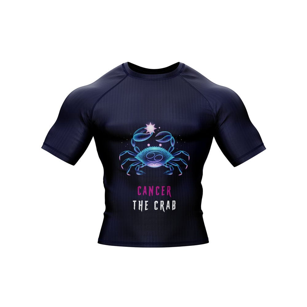 This premium sublimation design of the Cancer Zodiac Sign features The Crab print on both the front and back of the shirt; it has both long and short sleeves, a round neck, and a navy blue color scheme. Wear it to the gym or to combat. Made from spandex fabric.